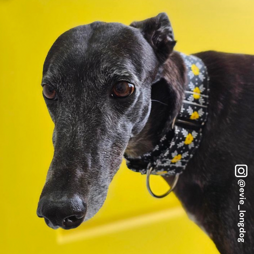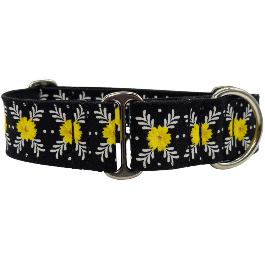 Elevate your pup's style with the "Daisy Delight Noir Martingale Collar". A mesmerizing blend of deep black sets the stage, while radiant yellow daisies with chic white-leaf outlines dance with joy, punctuated by delicate dots. A visual symphony for your greyhound's graceful neck, this collar is more than just a fashion statement - it's a testament to impeccable taste and unparalleled craftsmanship. 🐾💛