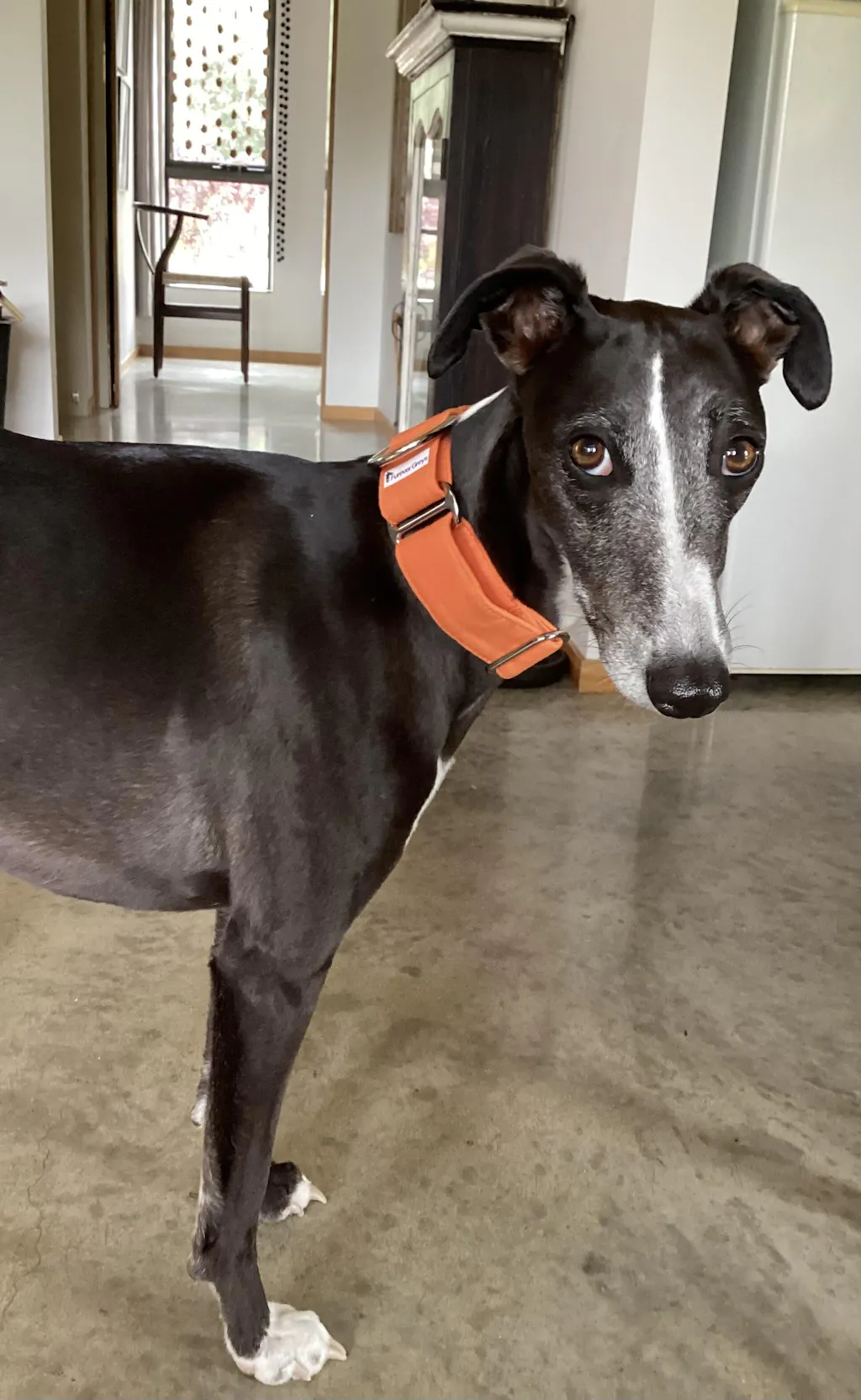 Embrace the vibrant spirit of fall with the Autumn Blaze Martingale Collar, expertly designed to combine style with functionality. Perfect for greyhounds and other sleek breeds, this collar showcases a stunning burnt orange hue, reminiscent of autumn leaves. Crafted with precision in Australia, the collar features high-quality polypropylene webbing encased in durable, laminated cotton for superior comfort and strength.