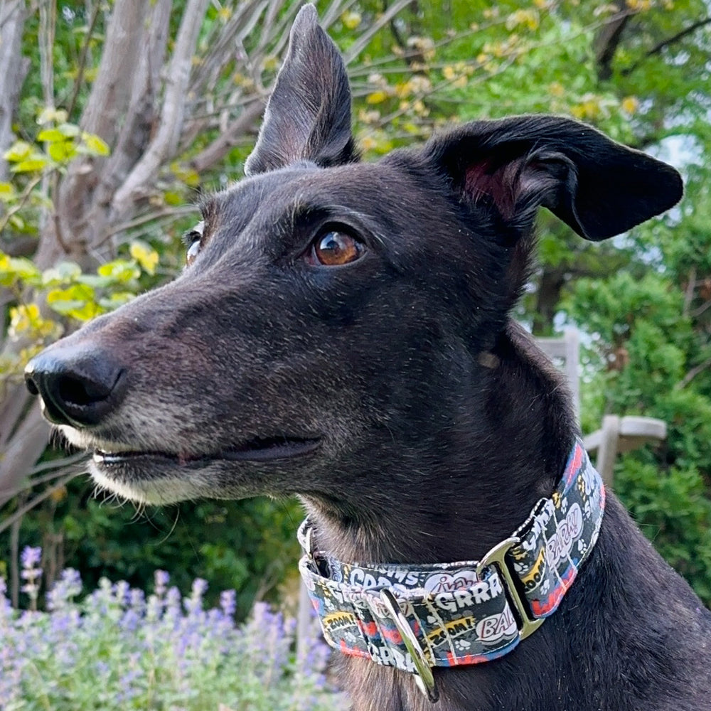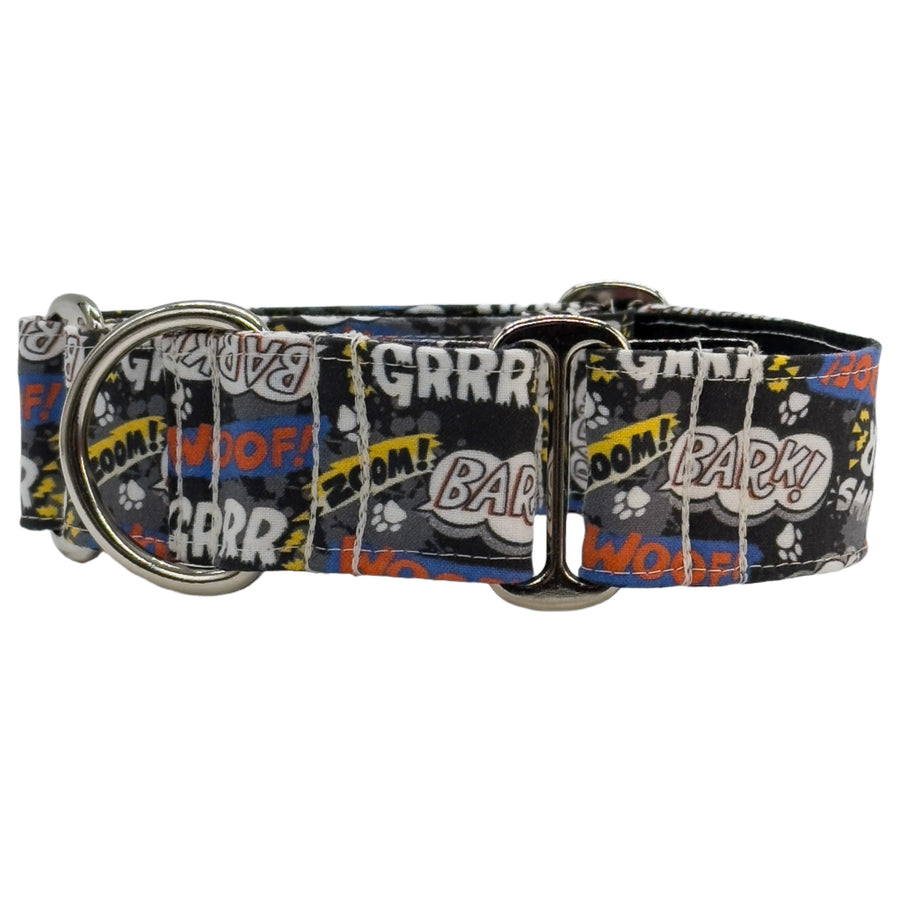 Unleash your pup's inner superhero with our Comic Canine Cues Martingale Collar! Featuring a striking black background adorned with classic comic exclamations like "woof", "zoom", "grrrrr", and "bark", this collar is perfect for the playful and expressive pooch. Not only is it a fashion statement, but itโs also designed with top-tier safety features to ensure your dog stays comfortable and secure on all adventures.