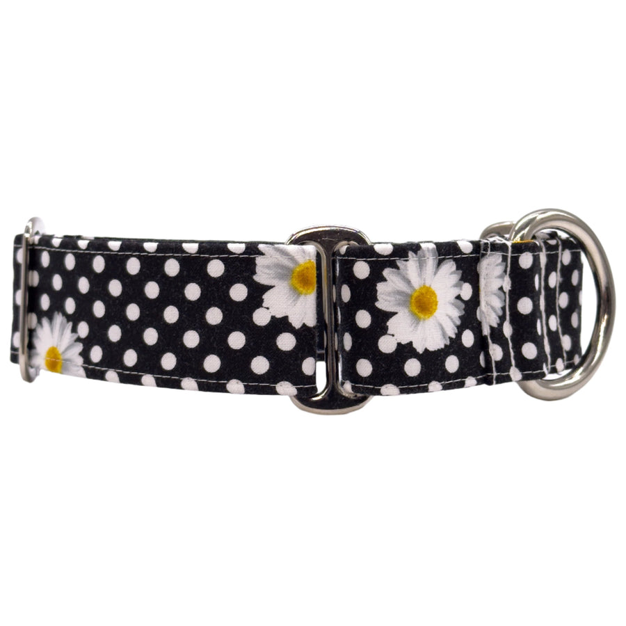 Step into the world of chic canine fashion with our Polka Petal Elegance Martingale Collar. Set against a sleek black backdrop, playful white spots rendezvous with dainty daisy flowers, creating a design that's both sophisticated and delightful. A true testament to impeccable style and craftsmanship for your precious pup. ๐ค๐ผ๐พ